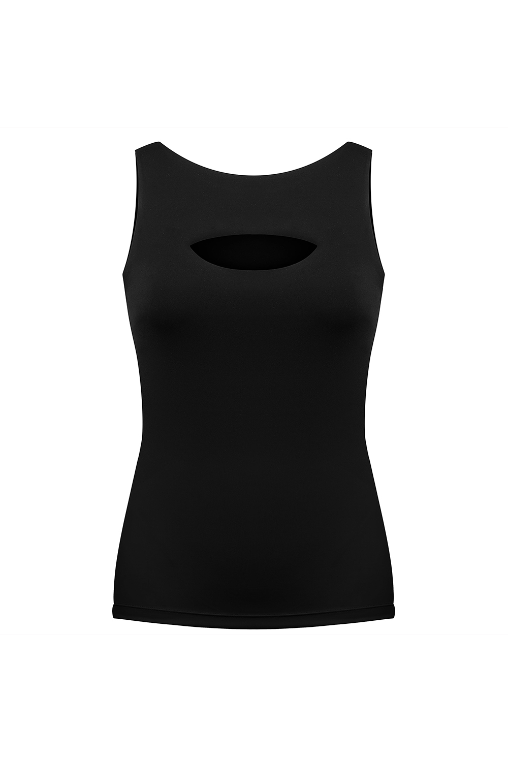 Racer neck tank top with integrated bra and elastic band under the chest for added support