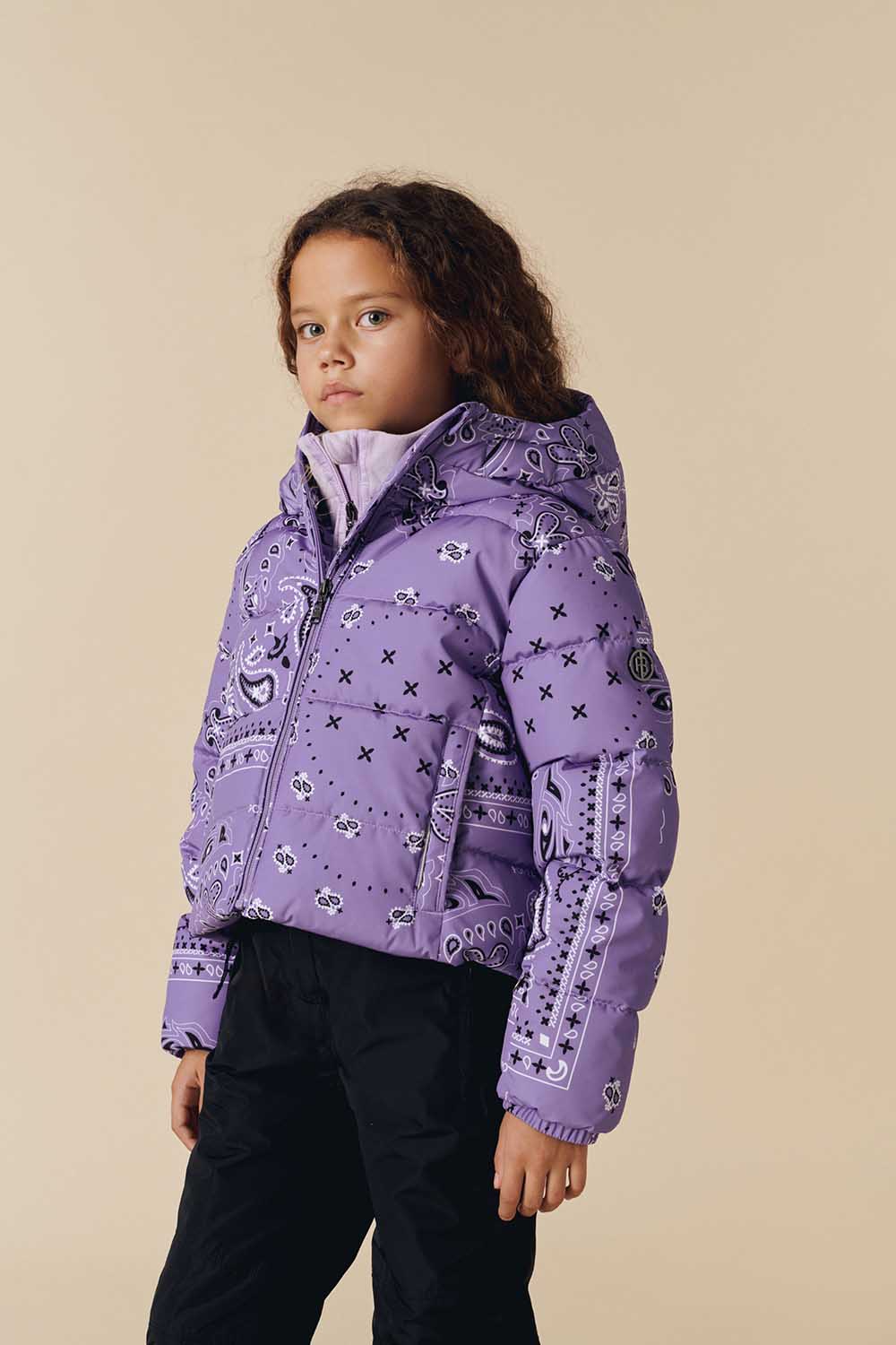 Chloe Down Jacket with Bandana Print merges elegance with practicality. Its sleek silhouette and integrated hood provide warmth and comfort, while the timeless print adds a stylish edge.