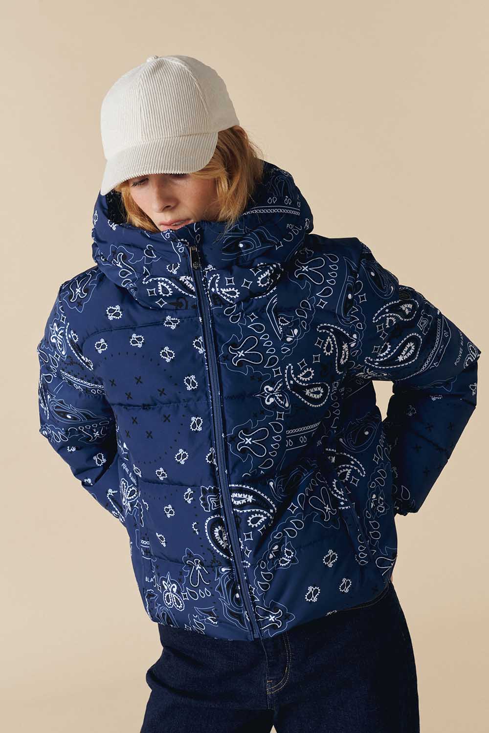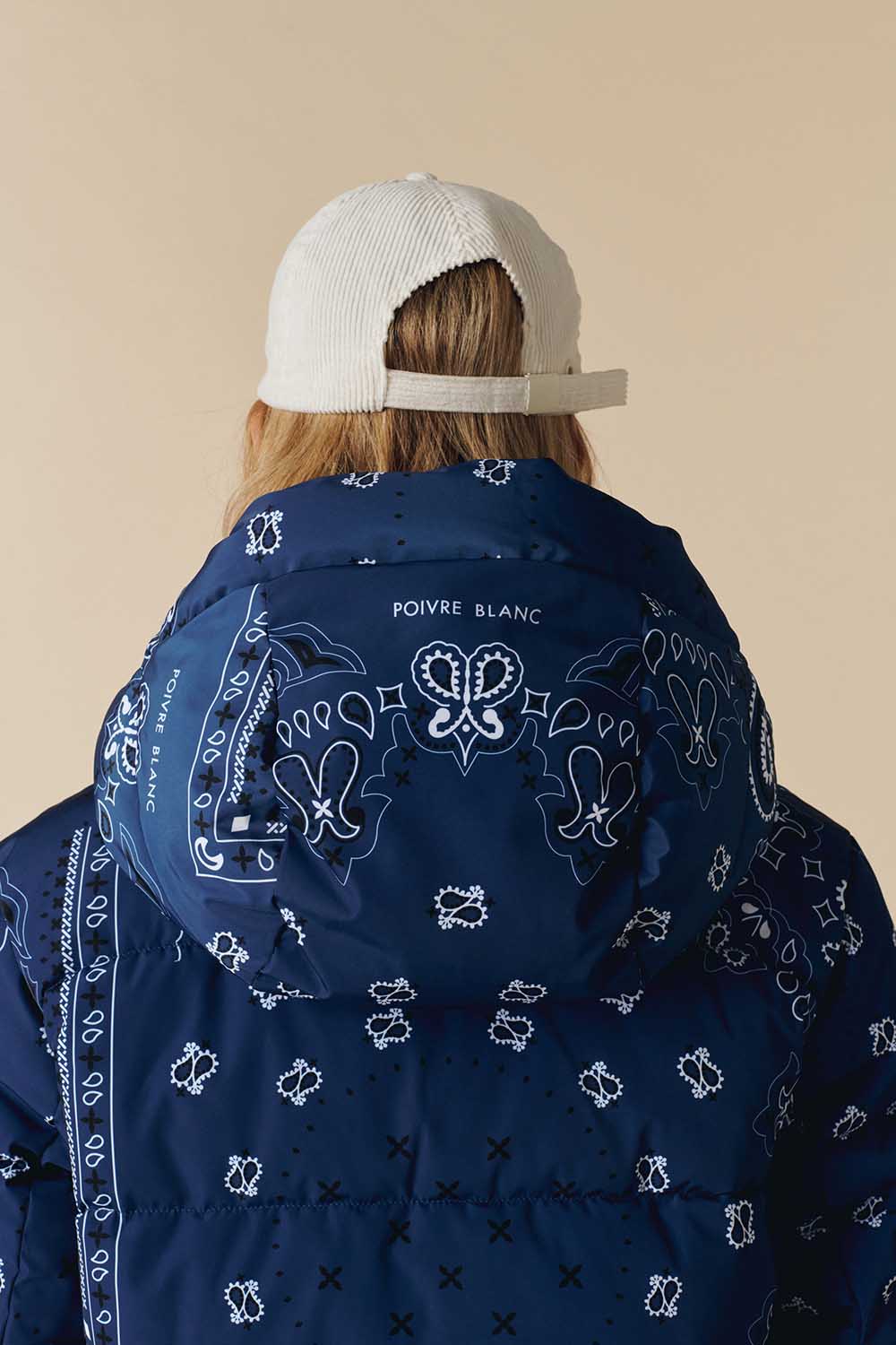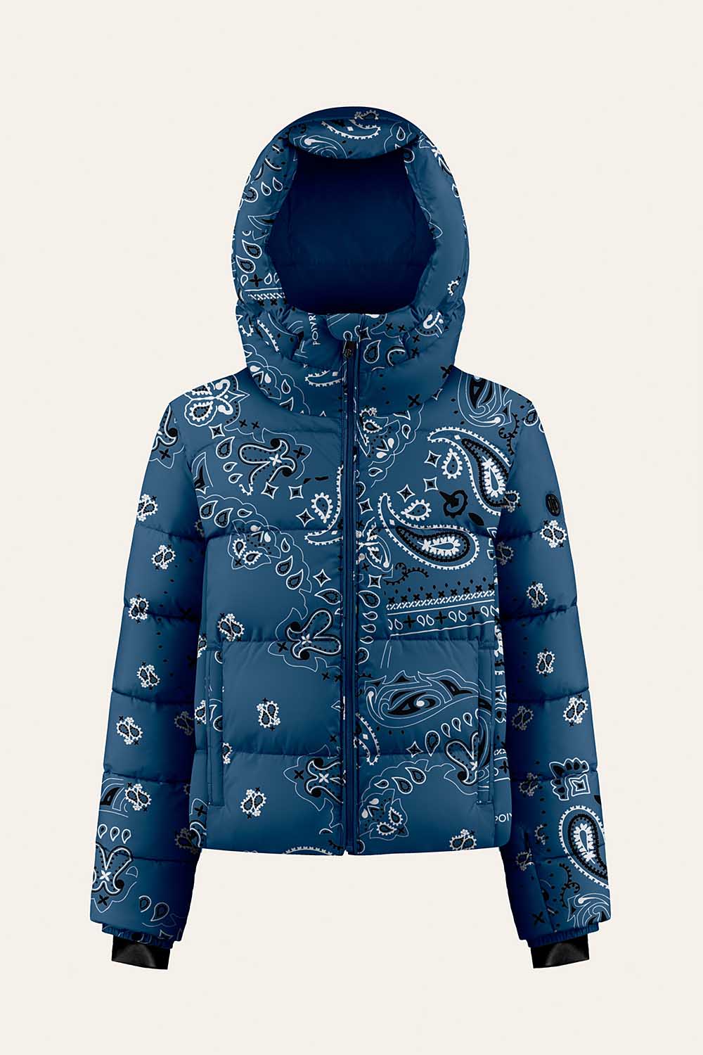 Chloe Down Jacket with Bandana Print merges elegance with practicality. Its sleek silhouette and integrated hood provide warmth and comfort, while the timeless print adds a stylish edge.