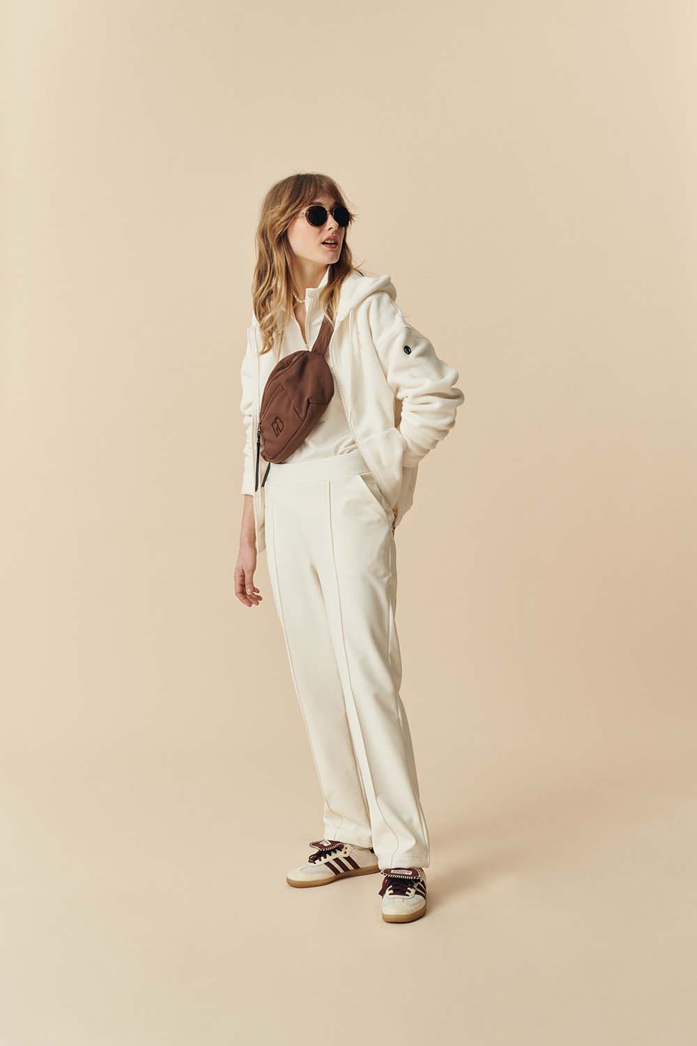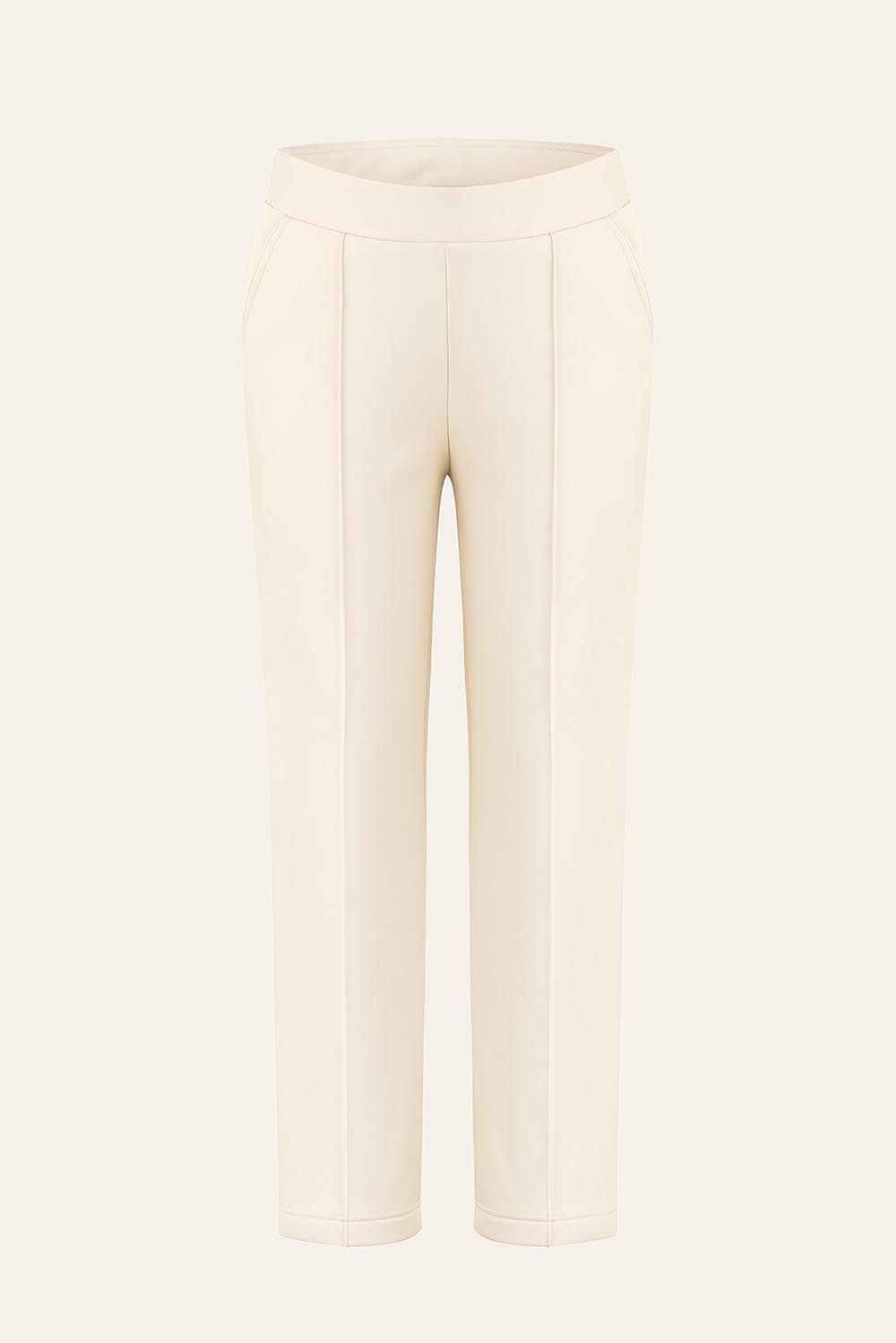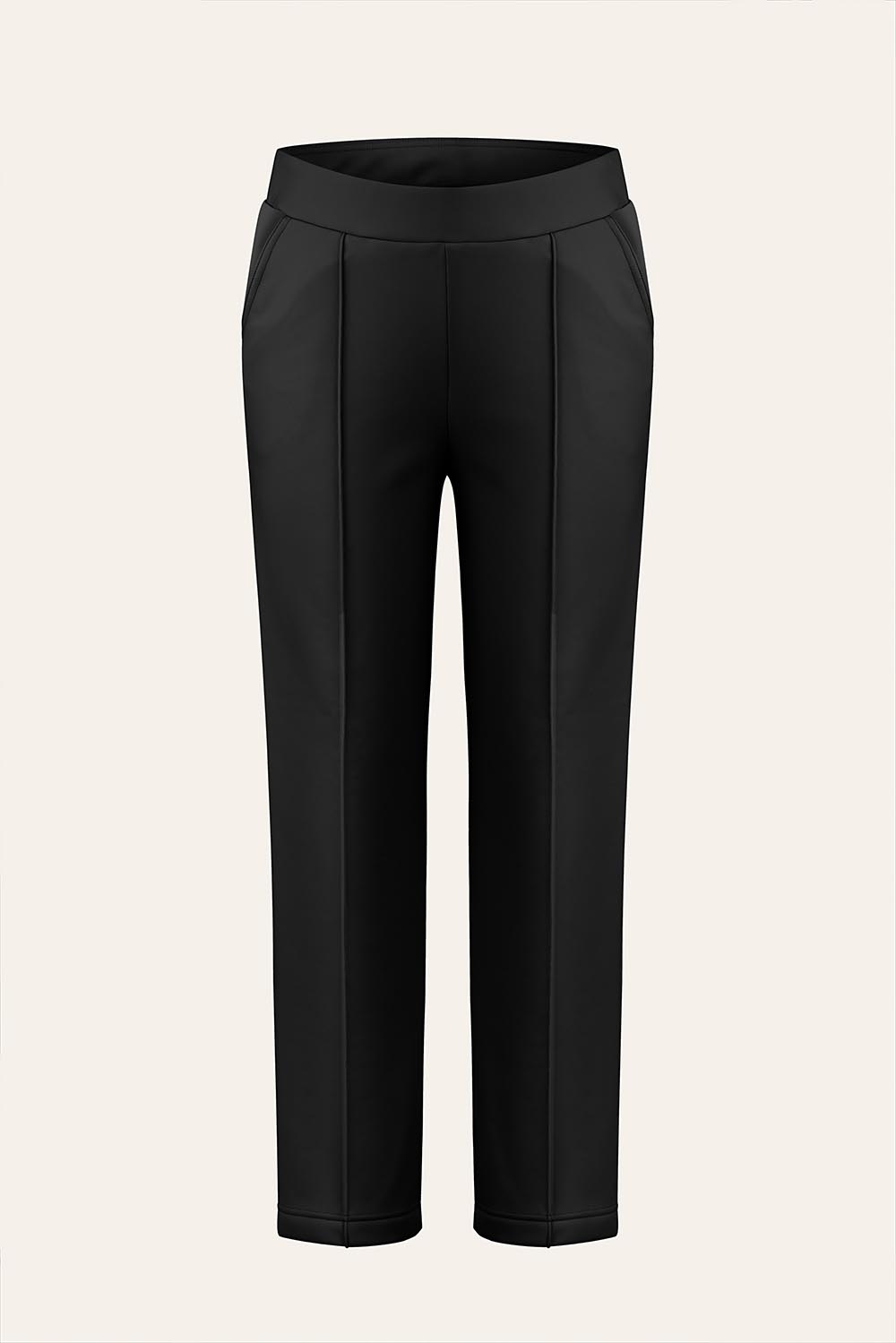 The Nola pants designed in neoprene fabric highlight a straight and structured cut.