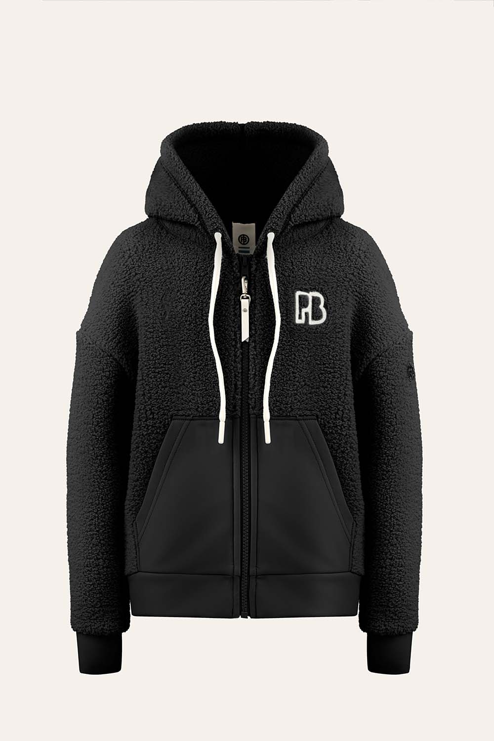 The Ninon hooded jacket designed in sherpa fleece mixed with neoprene fabric details offers a casual oversized look.