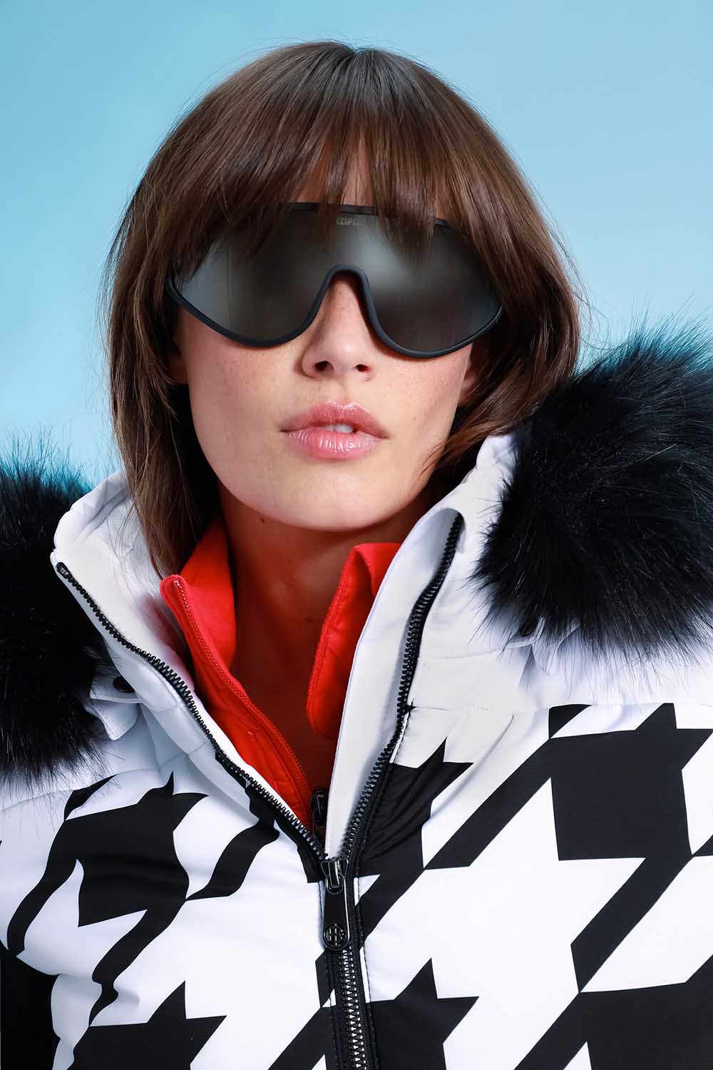 4-way stretch + allover print laminated fabric. Waterproof, breathable, water repellent.