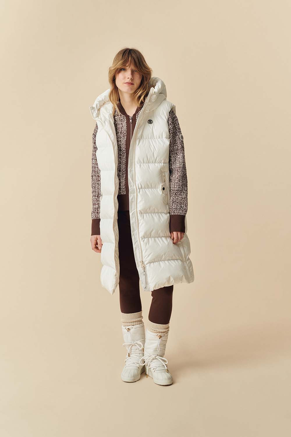 La doudoune longue sans manches Clea est conçue dans un tissu mat.