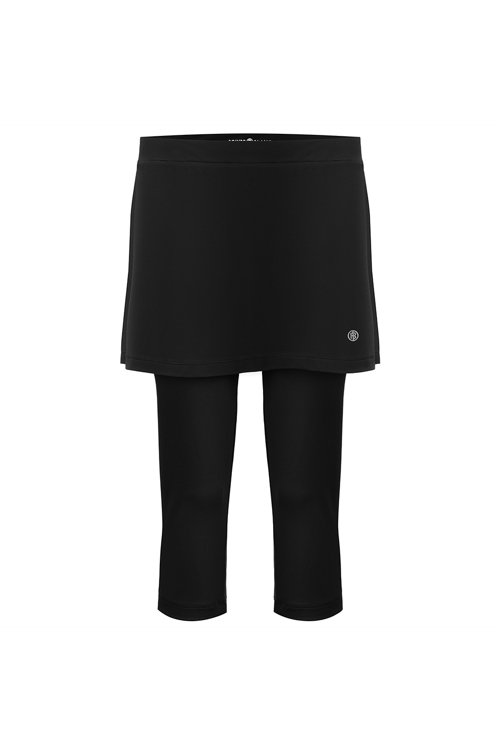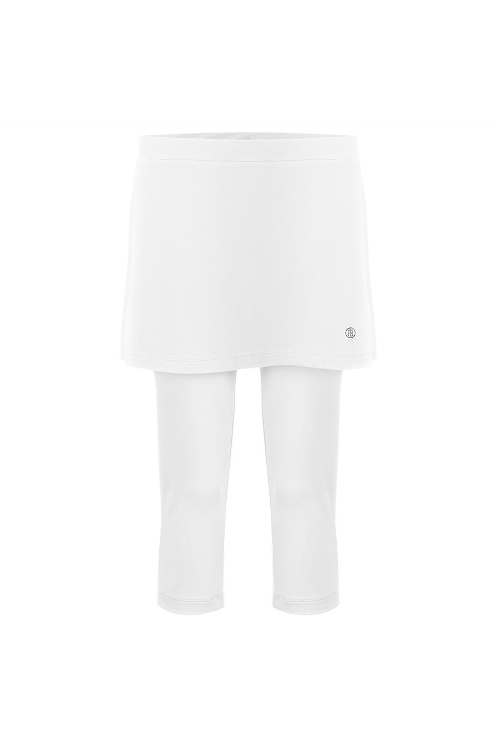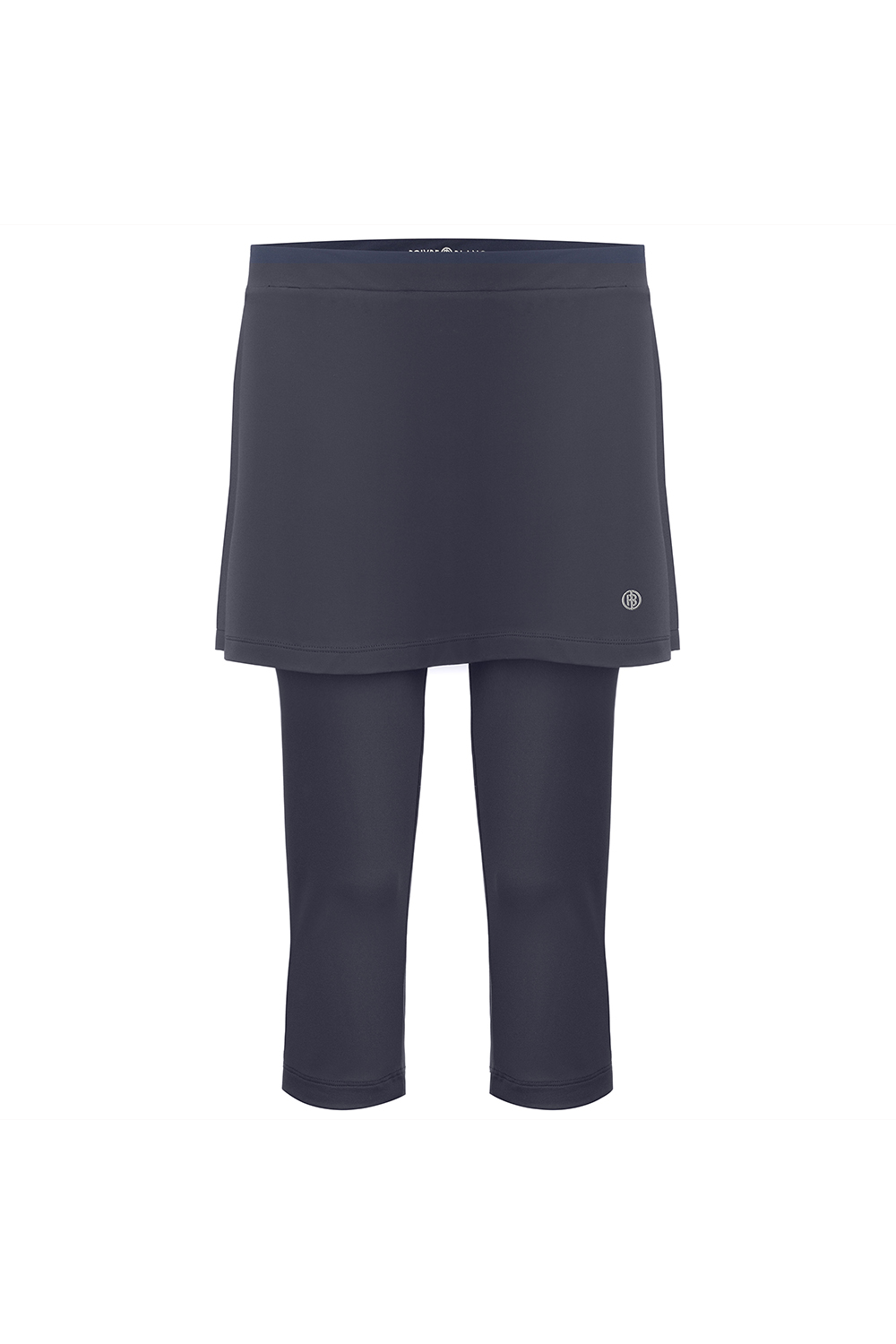 Legging mollet avec jupe courte, taille élastiquée, poche plaquée sur la culotte intégrée, en matière technique jersey Meryl, naturellement souple.