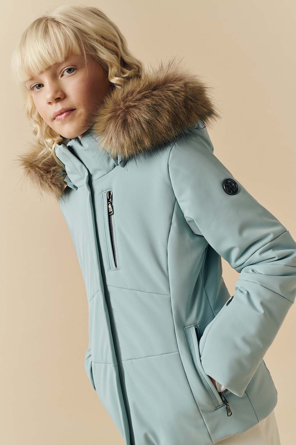 Elle est dotée d’une capuche amovible, d’une bande en fausse en fourrure et d’une jupe pare-neige.