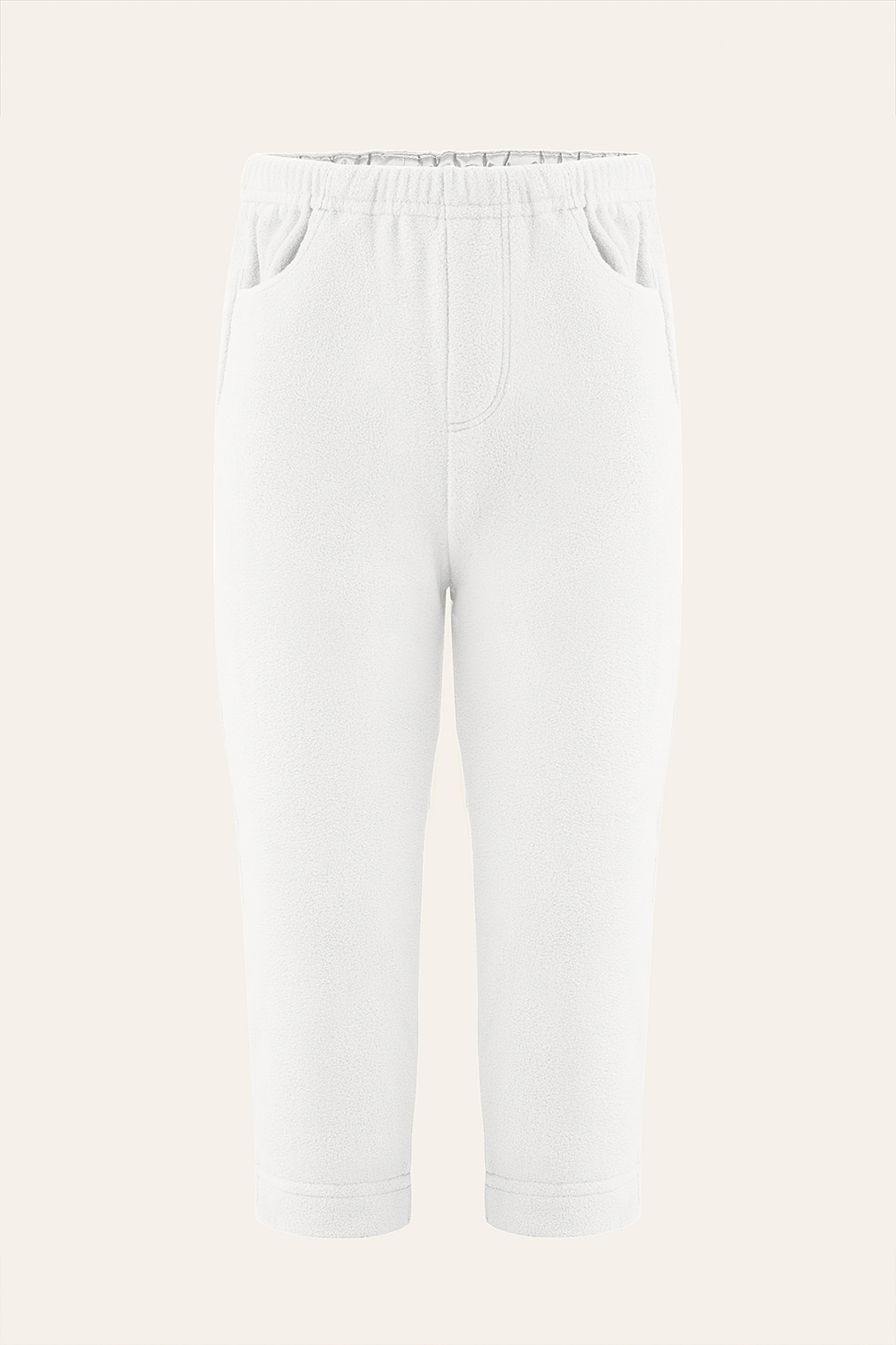 A relaxed fit and elastic waistband provide ease of movement. The Baby Pink color features a fluffier fabric with a cozy, softer touch.