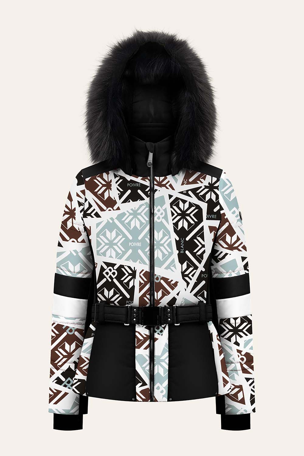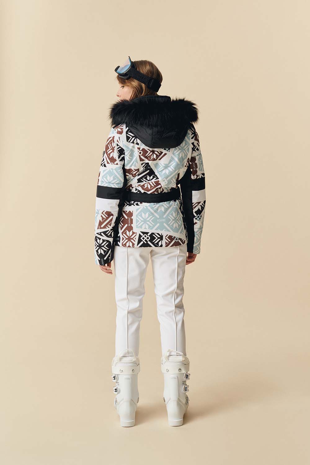 The Joana straight cut ski jacket is available in an iridescent fabric in a quilted or printed version.