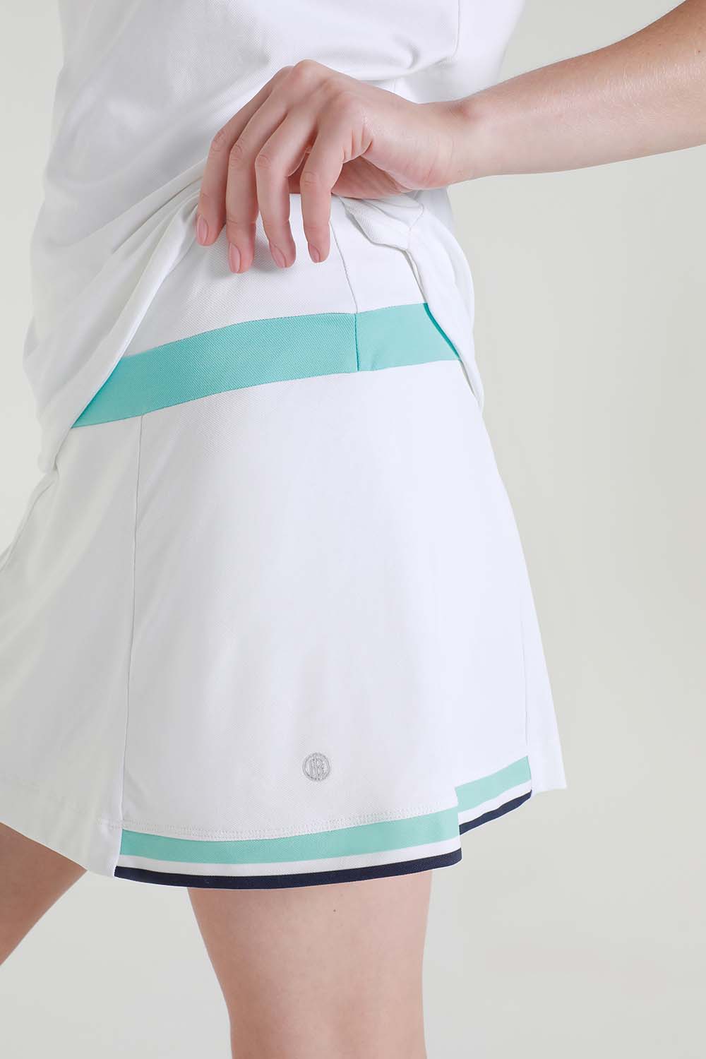 Jupe short avec taille élastiquée, poche plaquée sur la culotte intégrée, en matiere technique Piqué Meryl, naturellement doux.