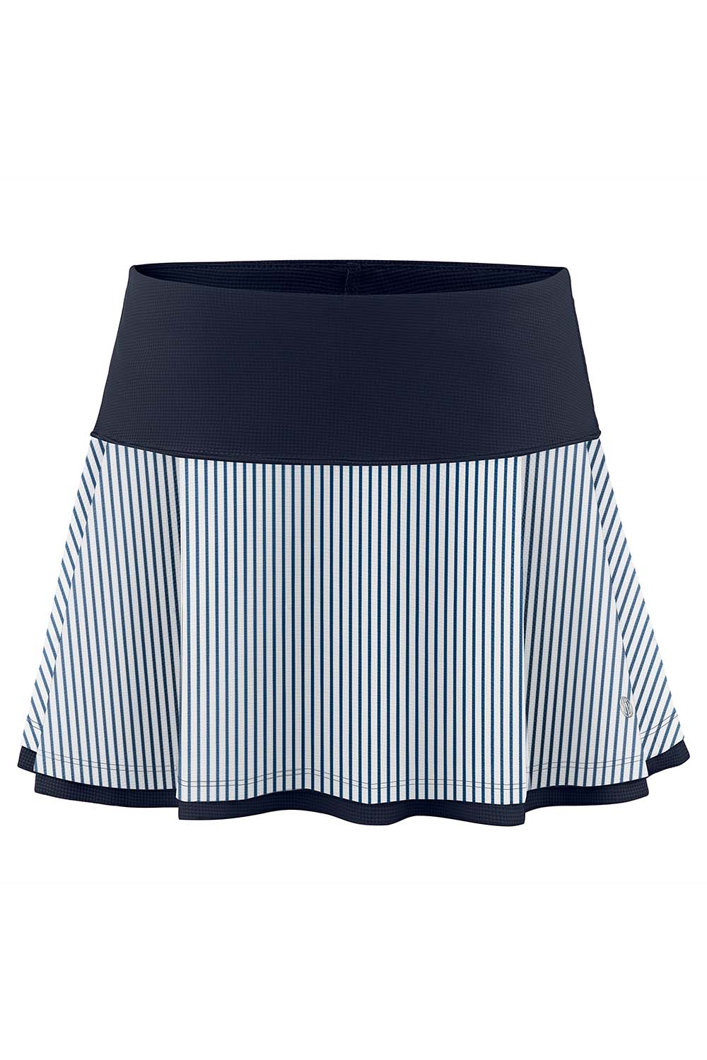 Jupe imprimée à rayures évasée avec short intérieur, taille élastiquée pour un ajustement confortable.
