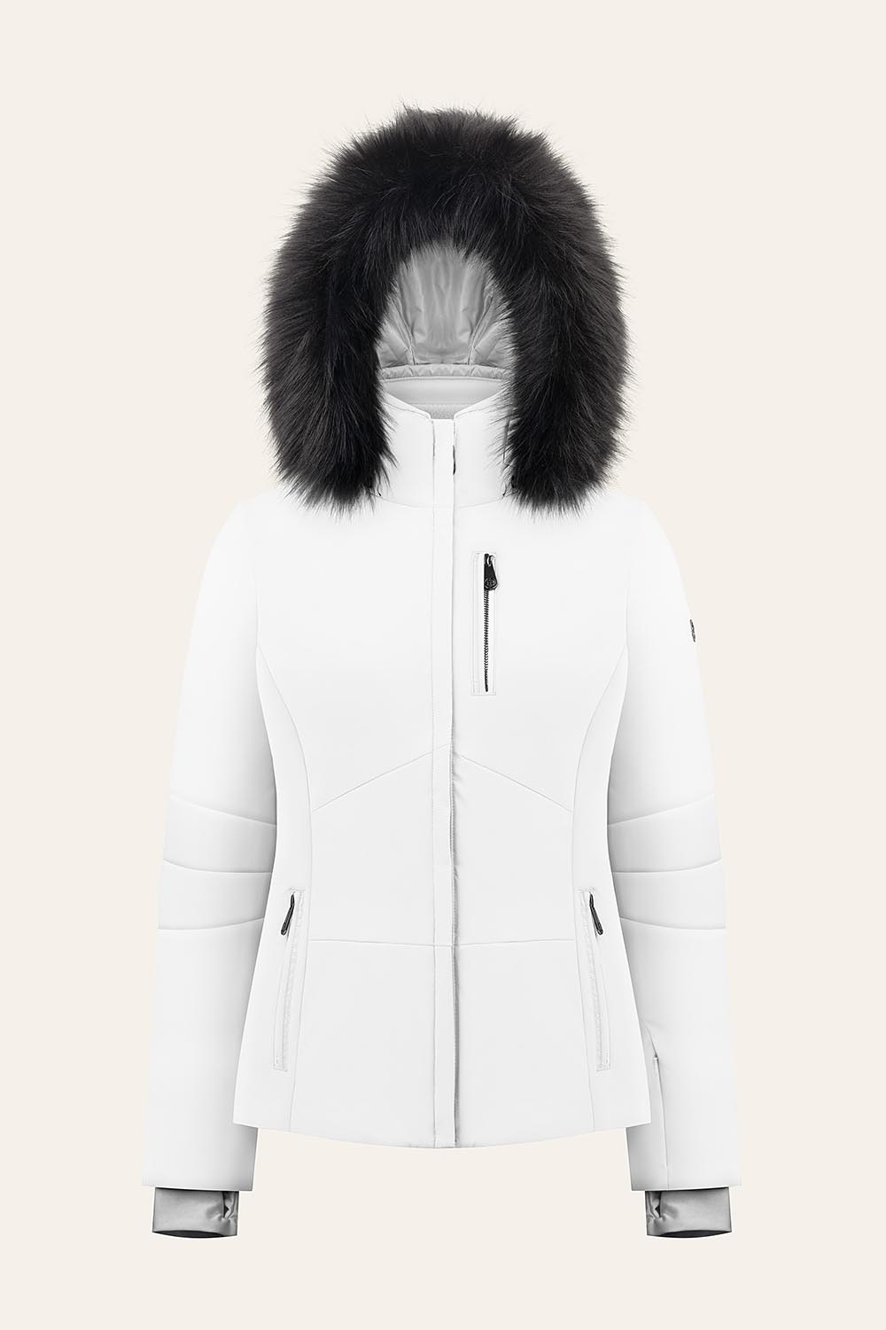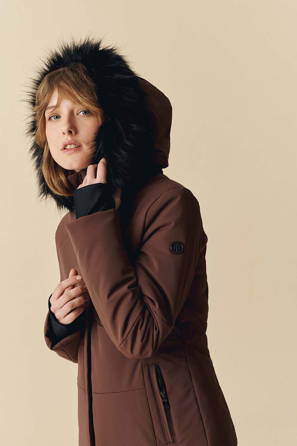 Elle est dotée d’une capuche amovible, d’une bande en fausse en fourrure et d’une jupe pare-neige.